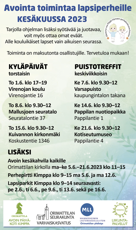 Kesällä 2023 järjestetään puistotreffejä ja kyläpäiviä eri puolilla Orimattilaa. Tervetuloa koko perheen voimin -kouluikäiset voivat tulla myös ilman aikuista.