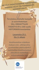 Koostamme MLL Orimattilan yhdistyksen 100v -historiikkia. Kuvien katselua, muistoja jne. voit myös ottaa omiasi mukaan. Vastuuhenkilöt Siru Sippo ja Henni Ahokas. |