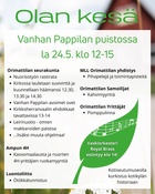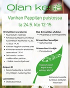 Olan Kesä kokoaa jälleen koko Orimattilan yhteen. Tapahtumaa vietetään toista kertaa tällä konseptilla, ja päivä täyttyy iloisesta markkinatunnelmasta, kulttuurista, esityksistä, lasten riemusta ja nuorten iltaohjelmasta. Tervetuloa viettämään koko kaupungin yhteistä kesäpäivää! MLL on mukana Pappilan puistossa klo 12-15 ja Nuorten tapahtumassa klo 18-22. https://orimattila.fi/tapahtuma/olan-kesa-2025-tapahtuma/ |