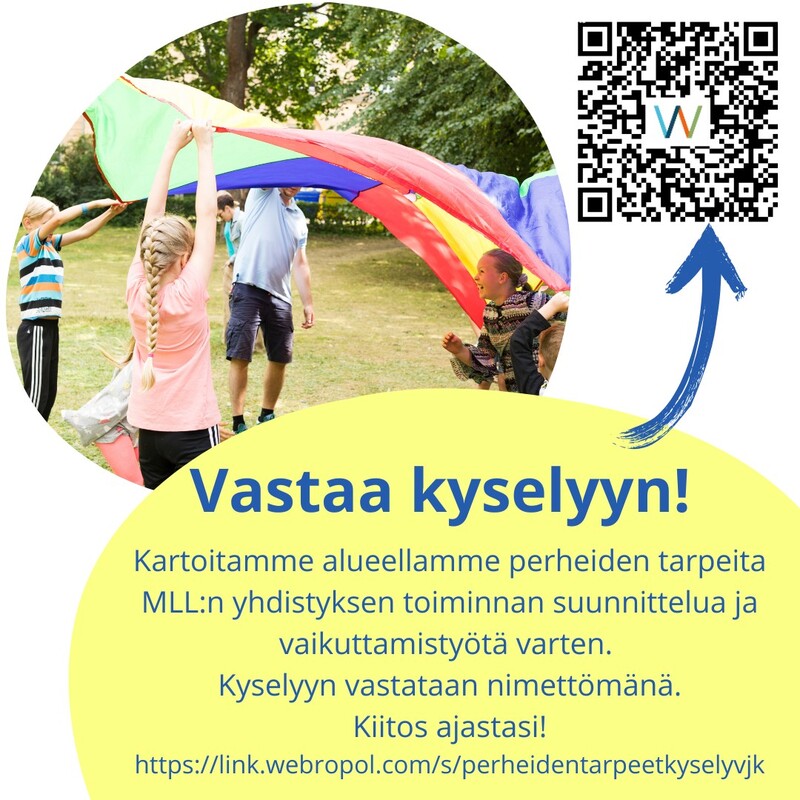 Vastaa kyselyyn!Kartoitamme alueellamme perheiden tarpeita MLL:n toiminnan suunnitelua ja vaikuttamistyötä varten. Vastauksia hyödynnetään toiminnan suunnittelussa ja kehittämisessä. Kyselyyn vastataan nimettömänä. Linkki kyselyyn: https://link.webropol.com/s/perheidentarpeetkyselyVJK |