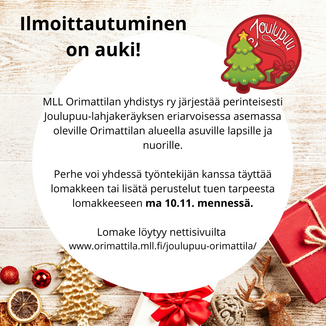 MLL Orimattilan yhdistys ry järjestää perinteisesti Joulupuu-lahjakeräyksen eriarvoisessa asemassa oleville Orimattilan ja Myrskylän alueella asuville lapsille ja nuorille ajalla 15.11. - 7.12.2025 K-supermarketin ja Prisman aulassa. Keräys on osa valtakunnallista Joulupuu ry:n keräystä ja toimimme vastuullisesti yhteistyössä valtakunnallisen keräyksen kanssa.