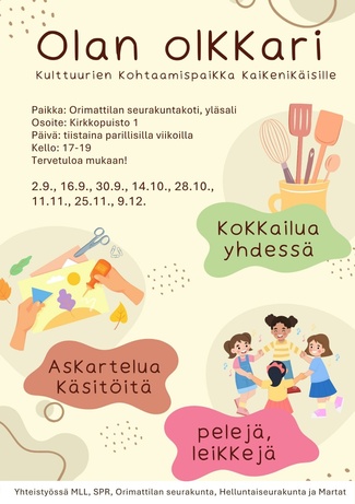 Olan Olkkari on kaikenikäisille tarkoitettu yhteinen (kulttuurien) kohtaamispaikka. Mukaan ovat tervetulleita niin kantasuomalaiset kuin muualta muuttaneet.